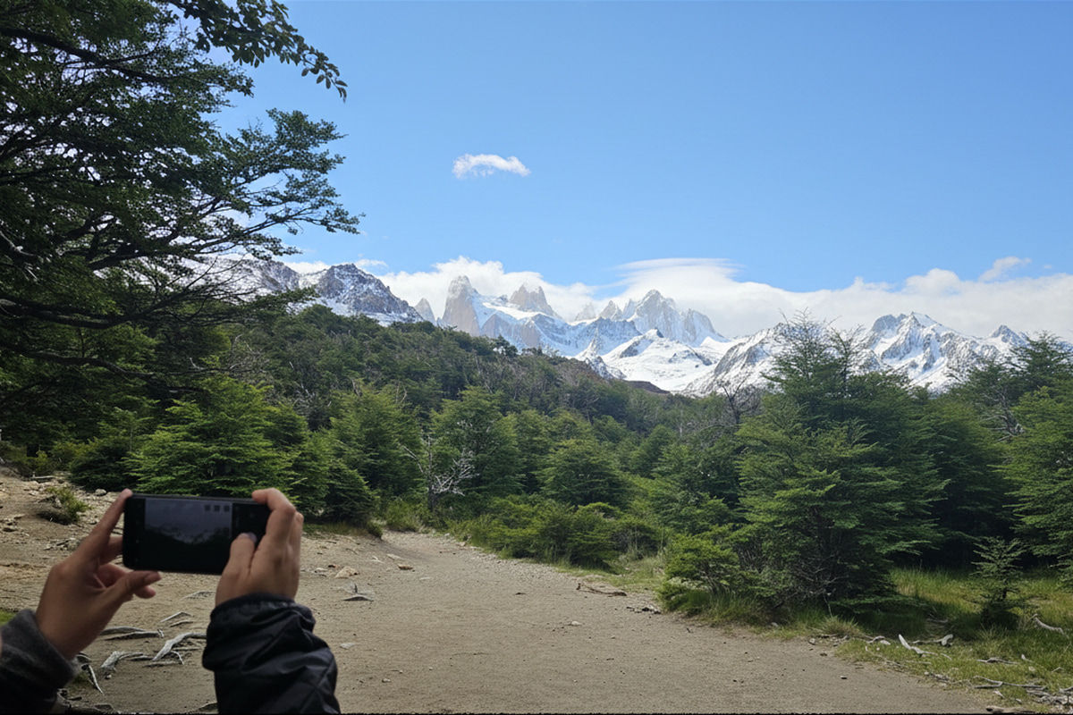 Ingresamos a la Zona Norte del Parque Nacional Los Glaciares, con el imponente Lago Viedma a lo lejos, marcando la transición hacia el paisaje de montaña. Al llegar a El Chaltén, reconocido oficialmente como la Capital Nacional del Trekking, vamos rumbo al norte del pueblo para llegar al inicio del sendero del Trekking Laguna Capri. Nos tomamos un momento para prepararnos antes de iniciar la caminata, adaptando el ritmo y conectando con el entorno que nos rodea, con el Monte Fitz Roy cada vez más presente.